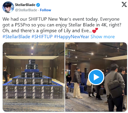 This envy-inducing story comes from X of StellarBlade (with a blue check mark next to its name), who accompanied it with a photo of a pile of PS5 Pros and a clip of employees waiting to receive their consoles before leaving the event, along with the caption, "Today we have the SHIFTUP New Year Event. Everyone get a PS5 Pro so you can enjoy Stellar Blade in 4K, right? Oh, and there's Lily and Eve too..." Shift Up reportedly held its own New Year's party with around 311 attendees in Seoul on Monday, and each employee received a 5 million won ($3,752.60) bonus.